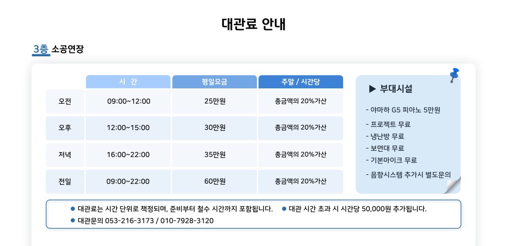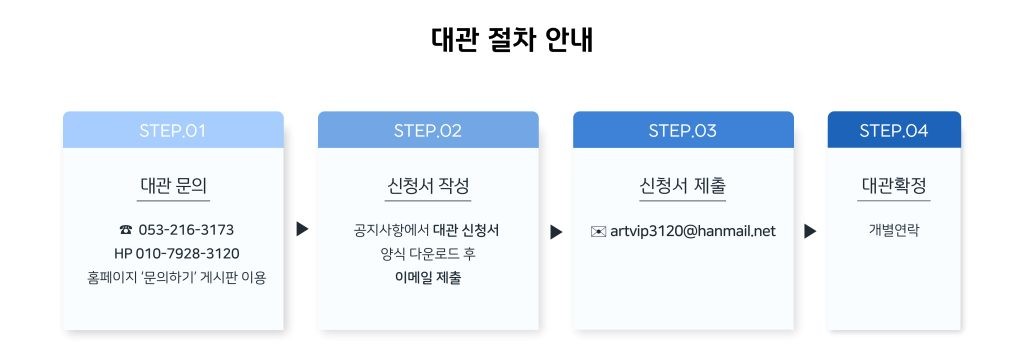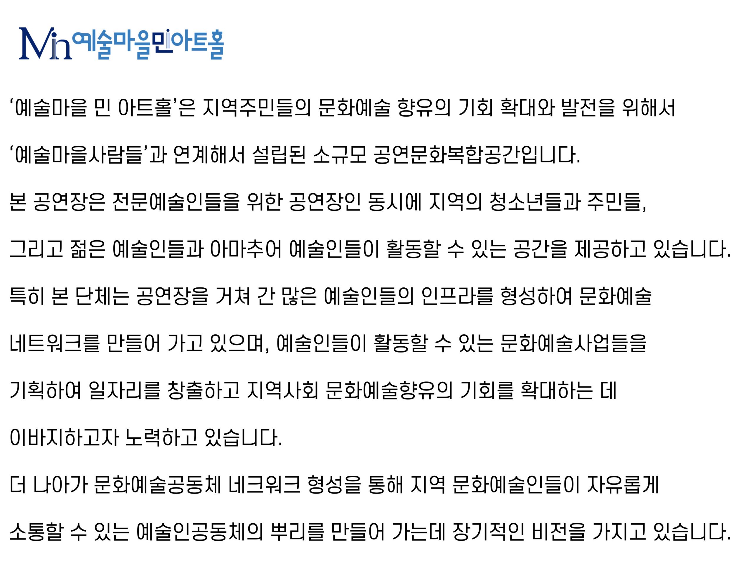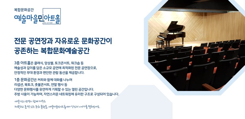 | | 예술마을 민 아트홀 대관 안내서 첨부된 대관신청서를 작성하신 뒤, 이메일(artvip3120@hanmail.net)로 제출해 주세요. manager2025-10-2764 |