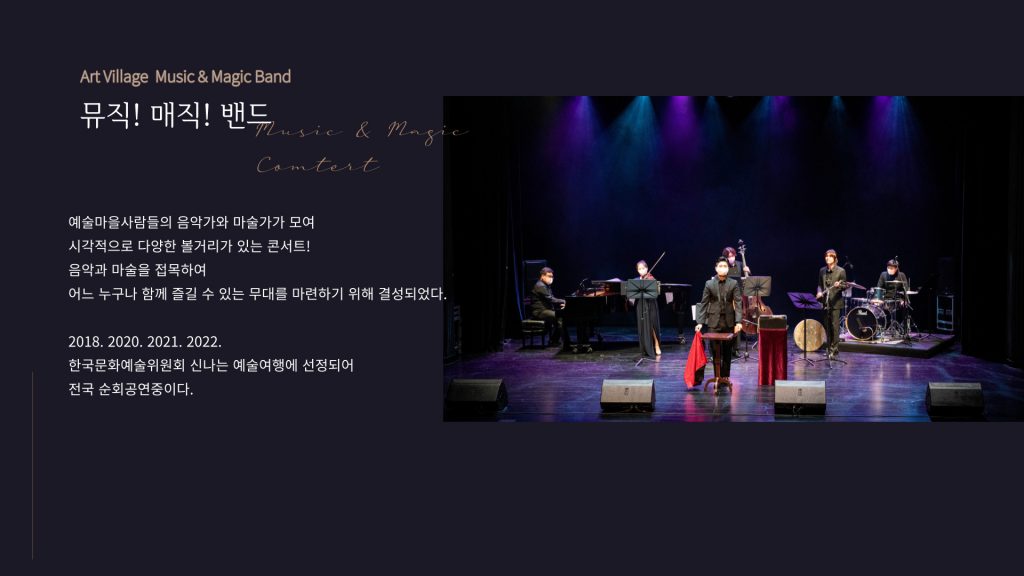 | | [공연안내] 마법글자 한글! 뮤직&매직밴드를 만나다! <---한글음악집현전 세번째 공연 한국문화예술위원회 공연예술창작주체 지원작음악 [마법글자 한글! 뮤직&매직밴드를 만나다!]2024년 7월 20일(토) 오후7시예술마을 민아트홀한글을 새로운 시각으로 탐구하여 한글의 아름다움과 음악적 감동이 어우러진[한글음악집현전] 시리즈 기획공연!!! 세 번째 공연을 소.. manager2024-07-03283 |